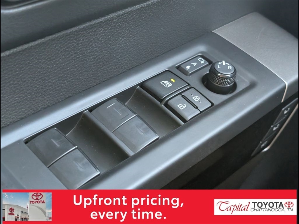 Dual front airbags, dual front seat side-impact airbags, dual front seat knee airbags, dual roll-sensing side curtain airbags, four-wheel disc brakes with anti-lock, brake assist, electronic brake force distribution, smart stop technology, traction control, vehicle stability control, automatic limited slip differential, pre-collision system with pedestrian protection, lane departure alert, sway warning system, automatic high beams, dynamic radar cruise control, daytime running lights, automatic power door locks, remote keyless entry, trailer sway control, anti theft system, engine immobilizer, and tire pressure monitoring system. SR5 Double Cab adds fog lights. TRD Double Cab adds navigation system. Limited Double Cab adds Bluetooth hands-free phone system and integrated trailer brake controller. Platinum CrewMax adds front and rear parking assist sonar system, blind spot monitor, and rear cross traffic alert.
