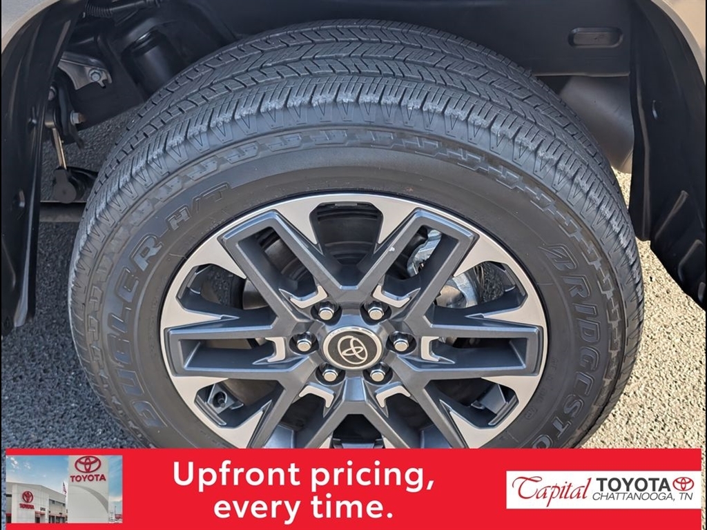 The brawny chiseled look of the Tundra is the ideal platform for the optional TRD Pro Off-Road Package. Model specific features include: split five-spoke TRD Off-Road Package alloy wheels with black accents and all-terrain P275/65R18 tires, trail-tuned Bilstein shock absorbers, engine skid plate, fuel tank skid plate, front tow hooks, LED fog lights (SR5), TRD Off Road floor mats (SR5/Limited), and bed side TRD Off-Road decal.